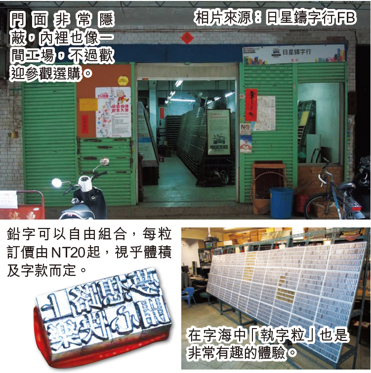 日星鑄字行已有50多年歷史,是台灣僅存的鑄字行。所謂鑄字即是香港所謂的「執字粒 」,上世紀直至50、60年代,很多印刷品包括報紙,都是靠鉛字粒逐粒砌好才付印。今時今日鑄字行已消聲匿跡,但在日星仍可重溫這門藝術。客人可以按指示,在「字海」中尋找喜愛的文字,製成獨一無二的印章。甚至把一組文字合併,成為別出心裁的名片或賀卡。