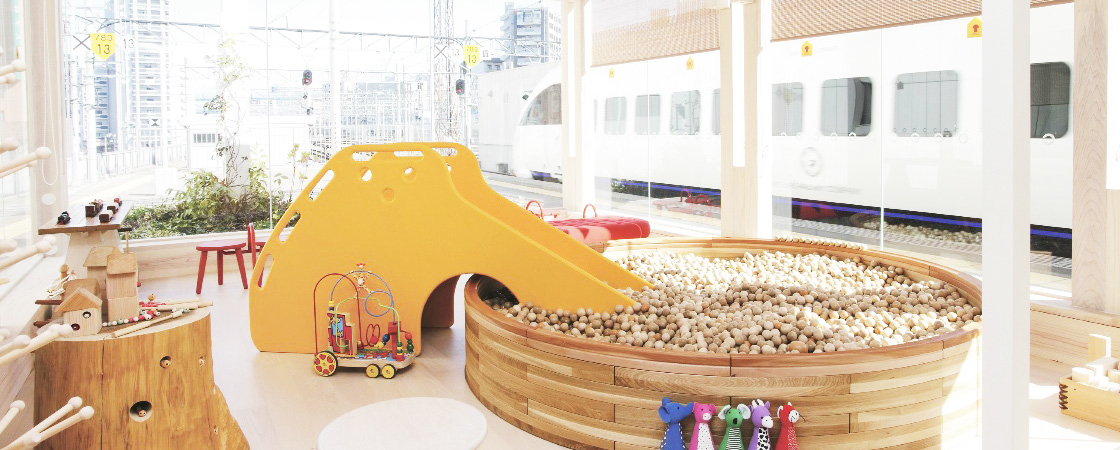 在日本等火車時,欠缺耐性的小朋友少不免會鼓譟起來。有見及此,貼心的日本人就設計了車站遊戲室,有小木屋、「煮飯仔」的小廚房、滑梯及波波池,全部由環保木材製造,小朋友玩得放心!