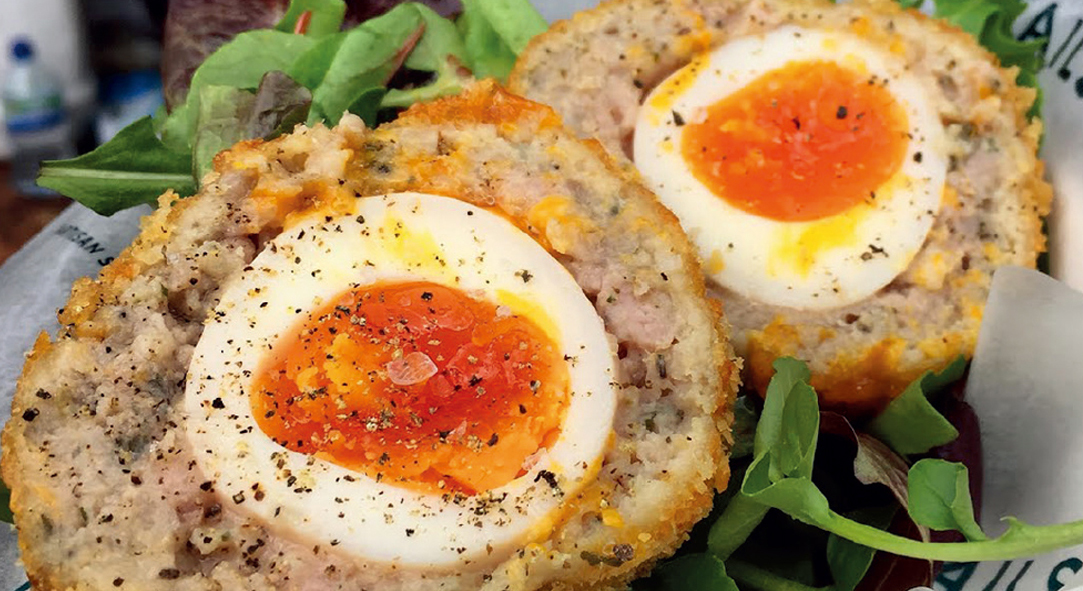 蘇格蘭蛋由免治豬肉餡包裹著雞蛋,再沾上蛋漿和麵包糠油炸至外面香脆金黃,內裡蛋黃仍然保持溏心。Scotchtails 採用的是著名農場Clarence Court 的Burford Brow 雞蛋,所以蛋黃大又有蛋香味,豬肉亦是用採取自然放養,品質絕對有保證。