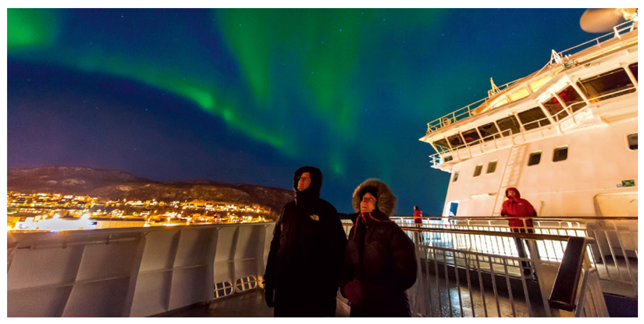 擁有120年歷史的Hurtigruten 是一間極有信譽的郵輪公司,提供來往挪威峽灣的航程,冬天時分更可能欣賞北極光。只要有任何發現,船員船長會立即通知乘客,不用在寒風中乾等。