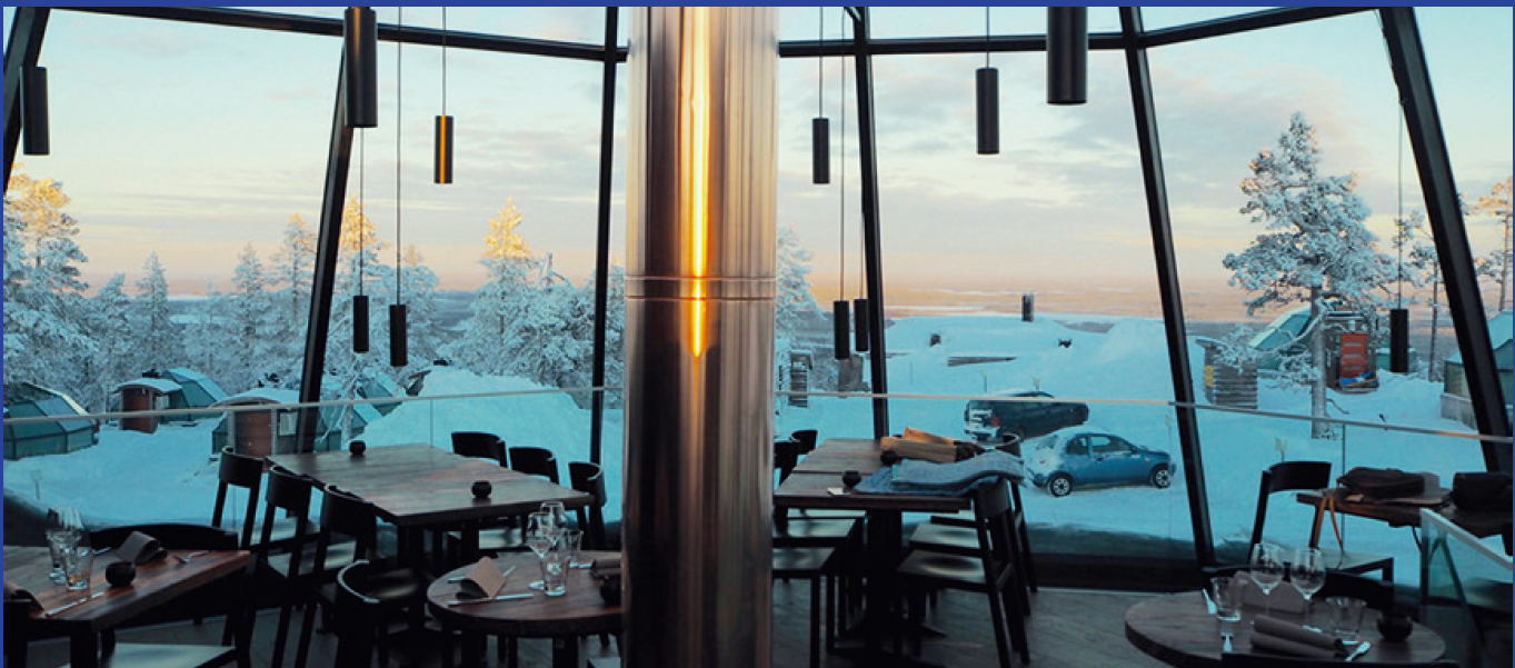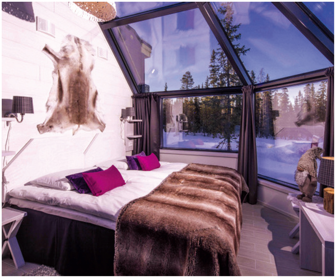 玻璃屋酒店Levin Iglut 真正擁有360° 視角,採用隔熱供暖的玻璃圓頂,張開眼就能看到極光。即使不入住,也可光顧其Aurora Sky 餐廳,客人可以一邊用膳一邊仰頭就能觀賞極光。
