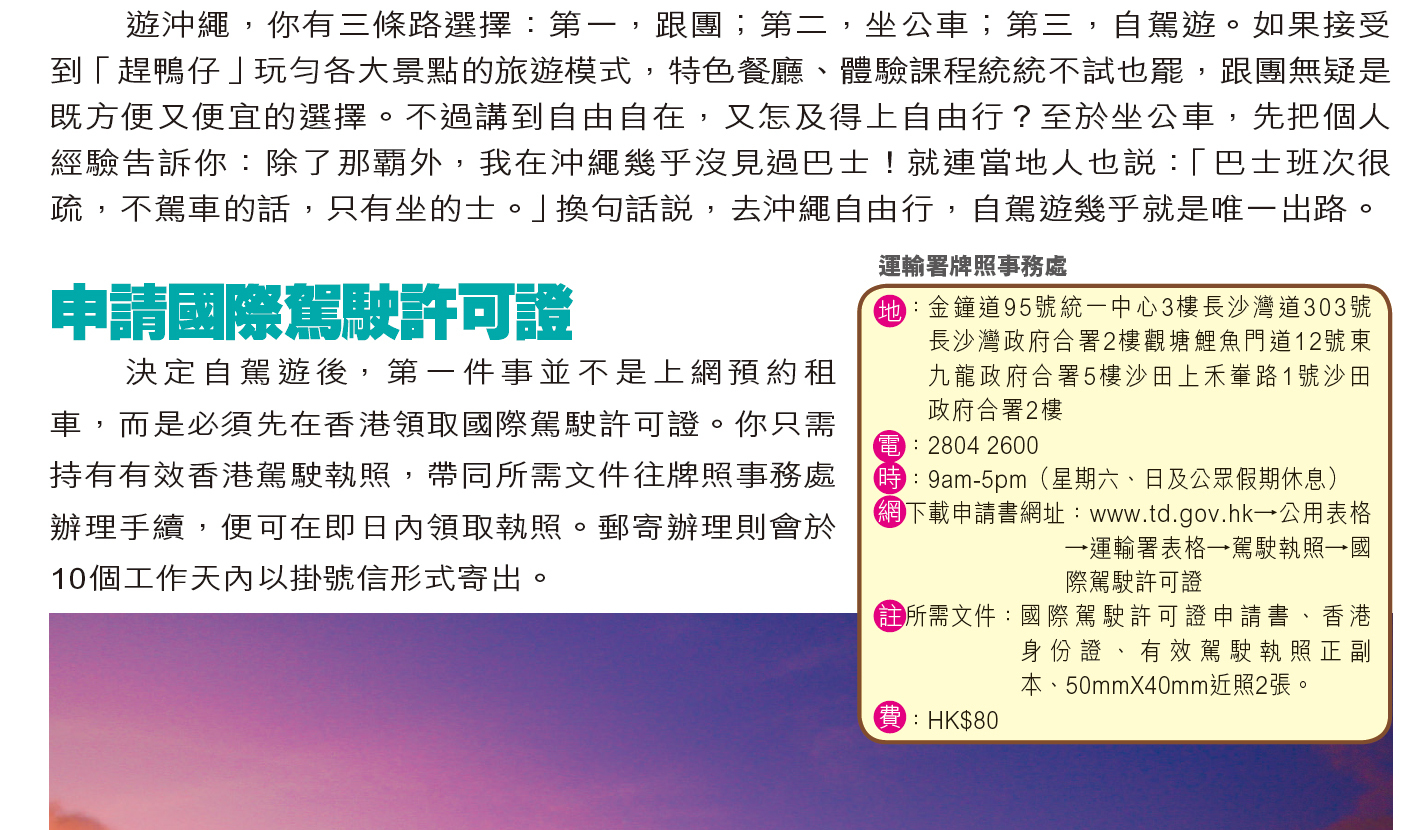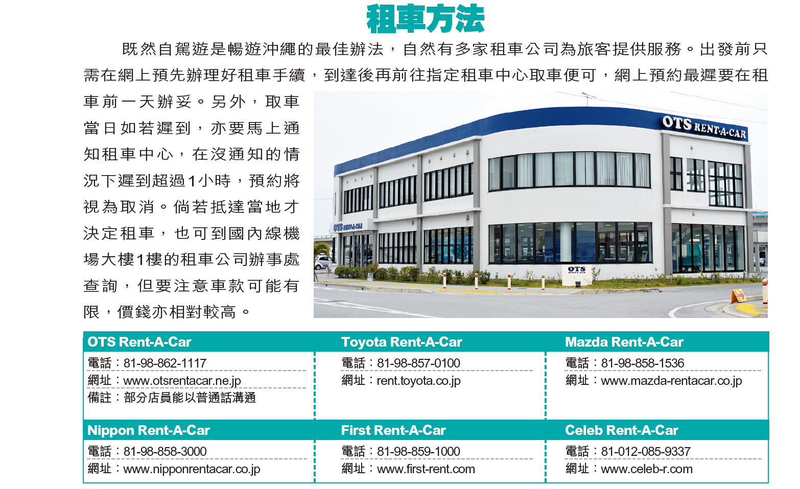 遊沖繩,你有三條路選擇:第一,跟團;第二,坐公車;第三,自駕遊。如果接受到「趕鴨仔」玩勻各大景點的旅遊模式,特色餐廳、體驗課程統統不試也罷,跟團無疑是既方便又便宜的選擇。不過講到自由自在,又怎及得上自由行?