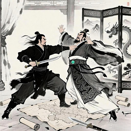 當「圖窮匕見」,氣氛卻沒有想像中的俐落。荊軻出手遲疑,秦王驚慌後退,扯斷衣袖,狼狽逃命。更荒謬的是,秦王一時拔不出長劍,只能繞著柱子奔跑;群臣因法令所限,不敢帶兵器上殿,也不敢擅動。最後,竟是一名醫官急中生智,用藥袋擲向荊軻,才爭取到關鍵幾秒。這一幕,與其說是英雄對決,不如說是制度僵化下的集體失序。