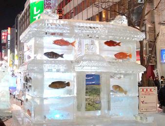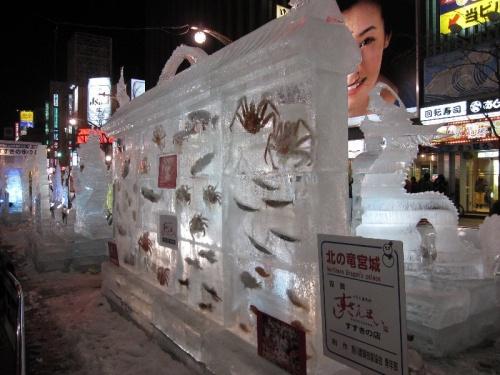 展示著有毛蟹和三文魚等富北海道特色的水產凍在冰塊裡的冰雕,以及各種具有幻想力的冰雕。
