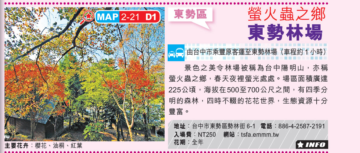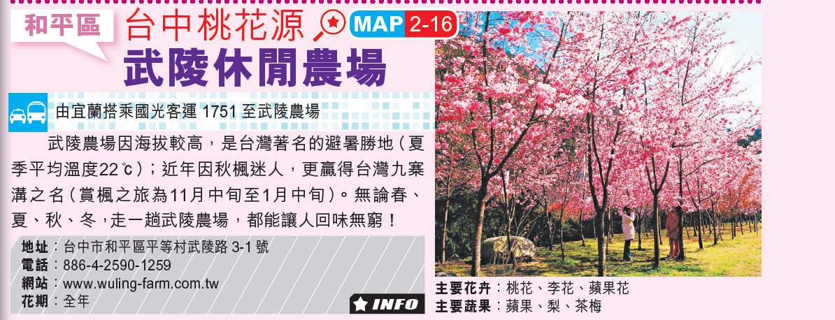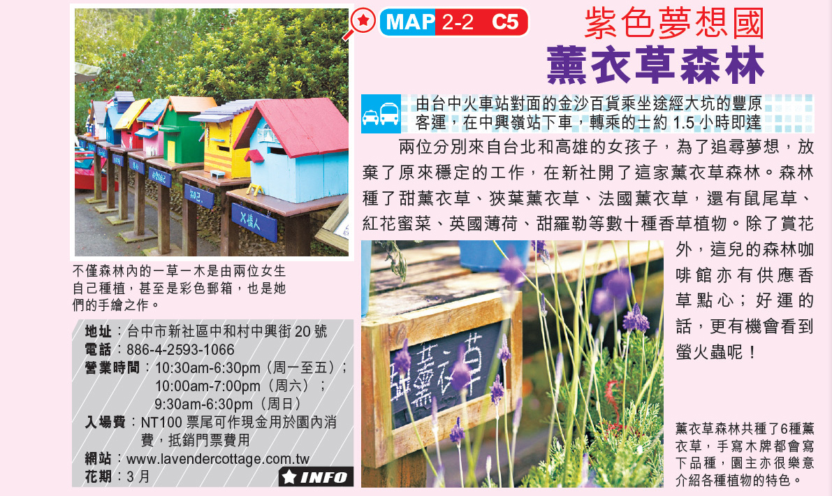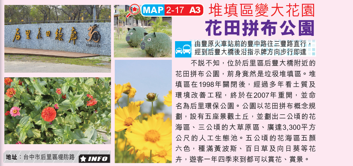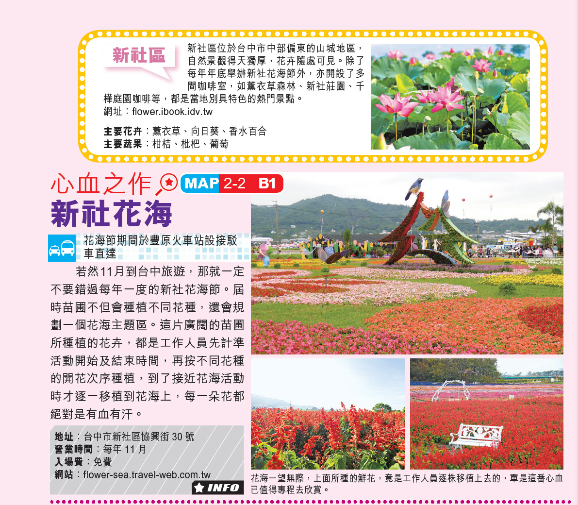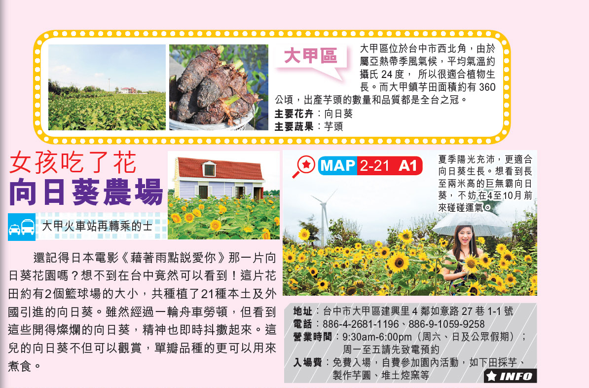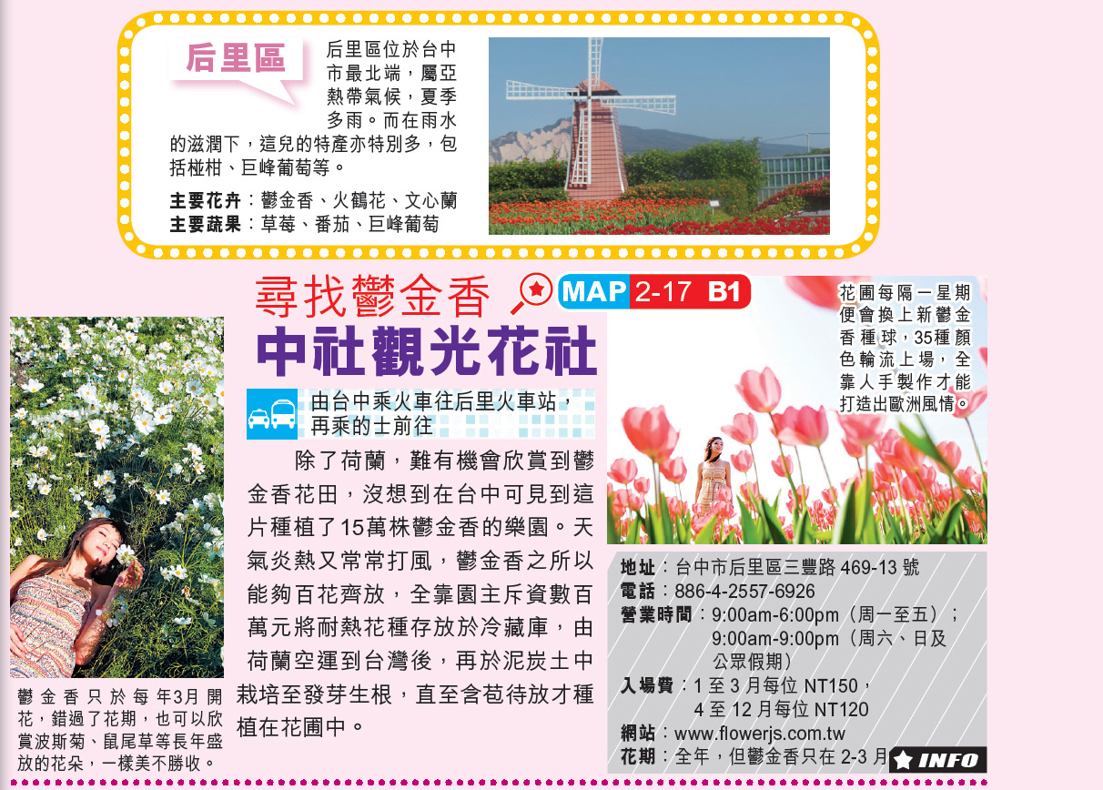 台灣中部地區天然物資豐富,台中、苗栗、南投、彰化一年四季都開滿不同種類的鮮花果實,是台灣著名的賞花勝地。想感受台中花海之美,從市中心乘車往近郊不過1小時車程,已見到一望無際的花田與農場。