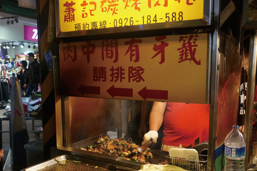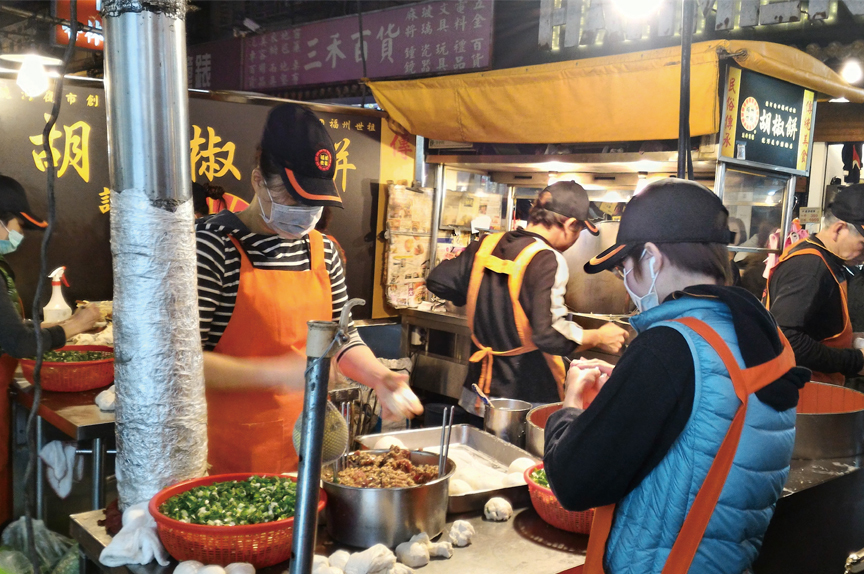 饒河街的福州胡椒餅總店,攤子前擠滿了人。老闆說餡內的肉都要先醃上12小時, 再加上十多種配料及得宜烘烤火候,使胡椒餅烤得剛剛好,不軟也不硬。