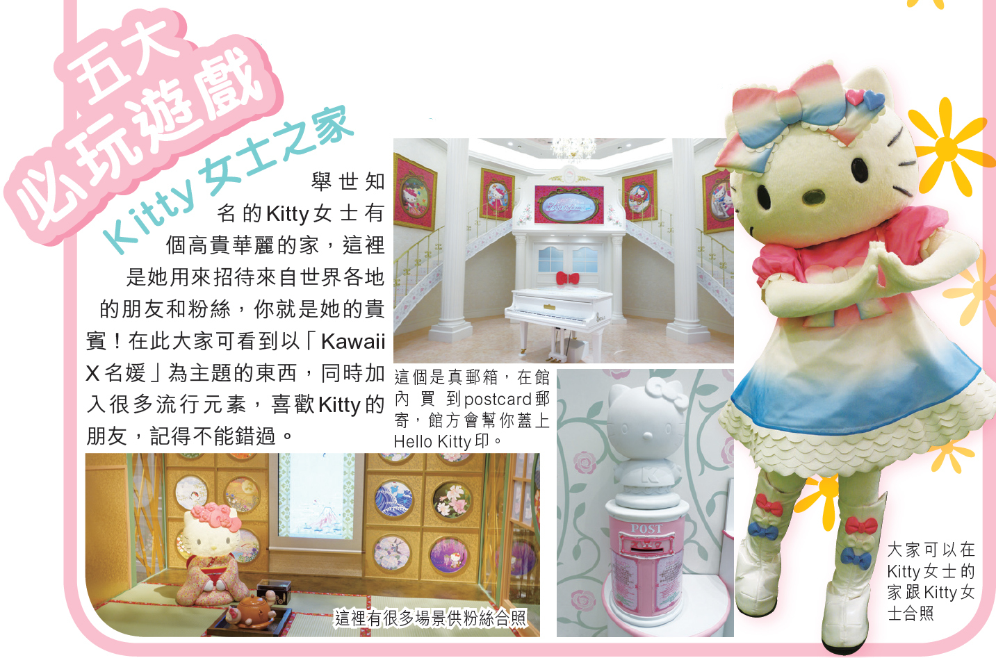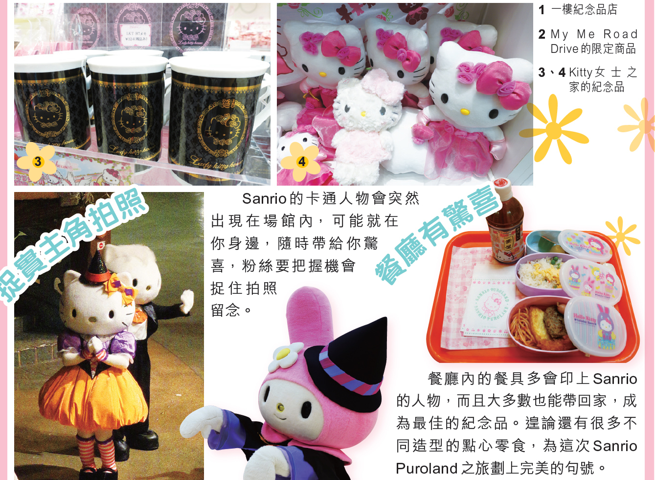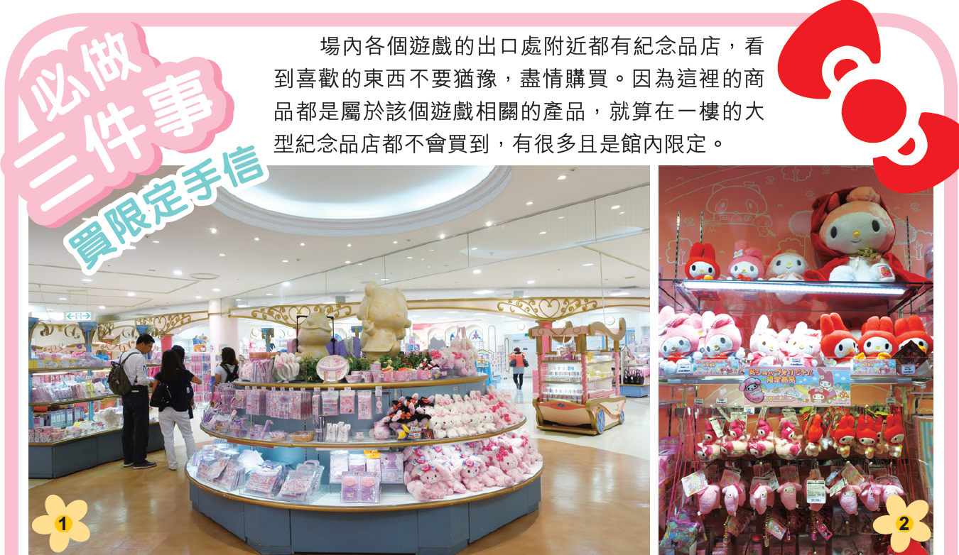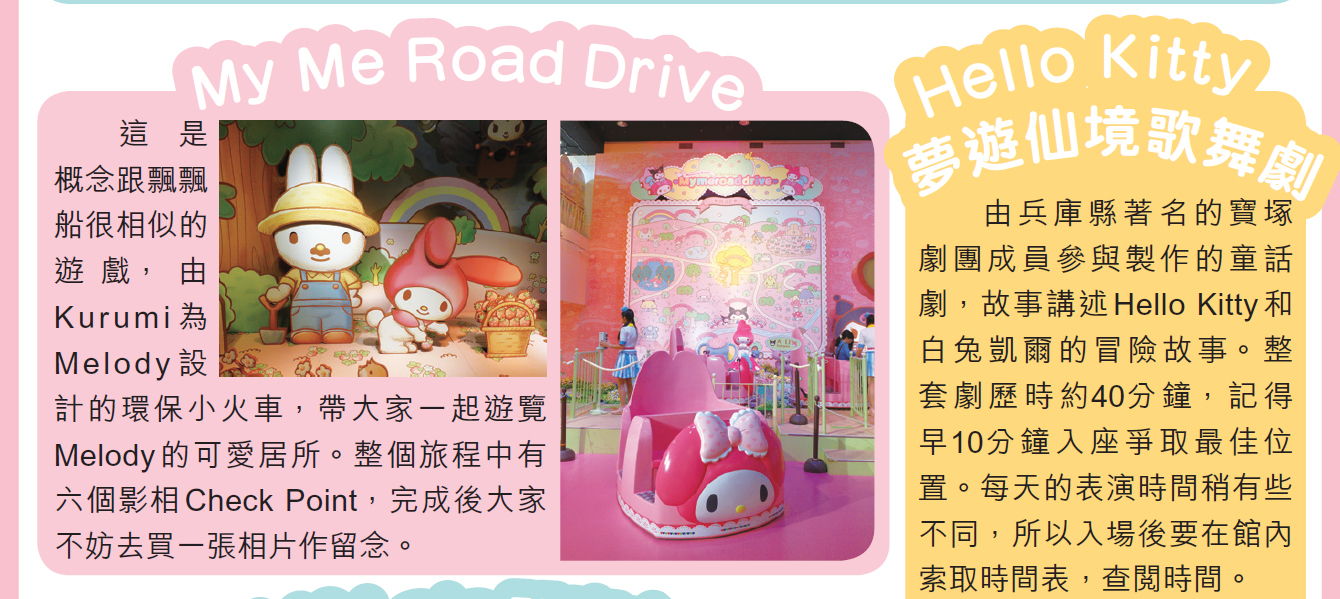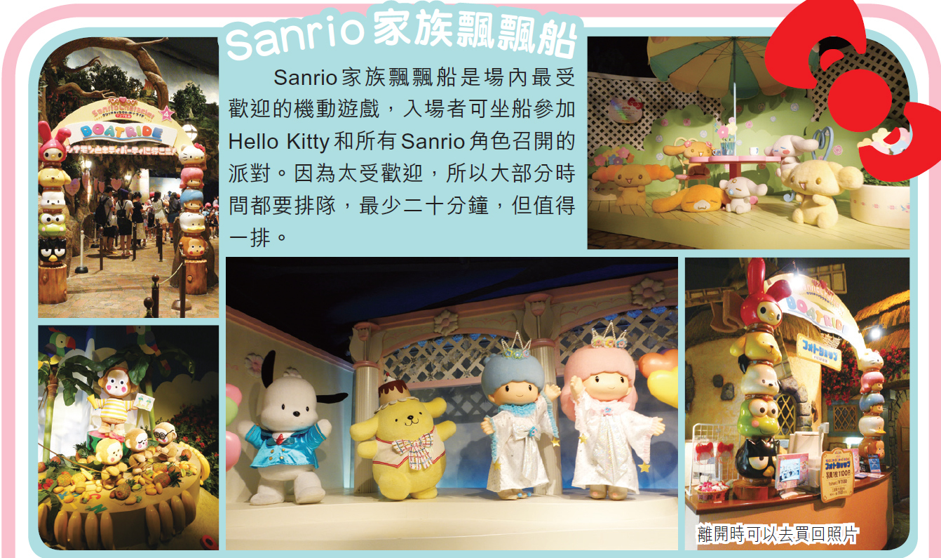 Sanrio Puroland 香港人多稱為Hello Kitty Land,場內不但到處可看見Hello kitty,而且還有很多Sanrio 卡通人物。不過,這裡機動遊戲不算太多,也不甚刺激,較為適合小朋友來到。雖然規模不及迪士尼,但各種館內限定的產品,Hello Kitty 迷定必帶著不捨得離開。由於Hello Kitty Land 的位置已離開東京23區,因此可配合深大寺鬼太郎茶屋和南大沢的行程,不用浪費車錢。